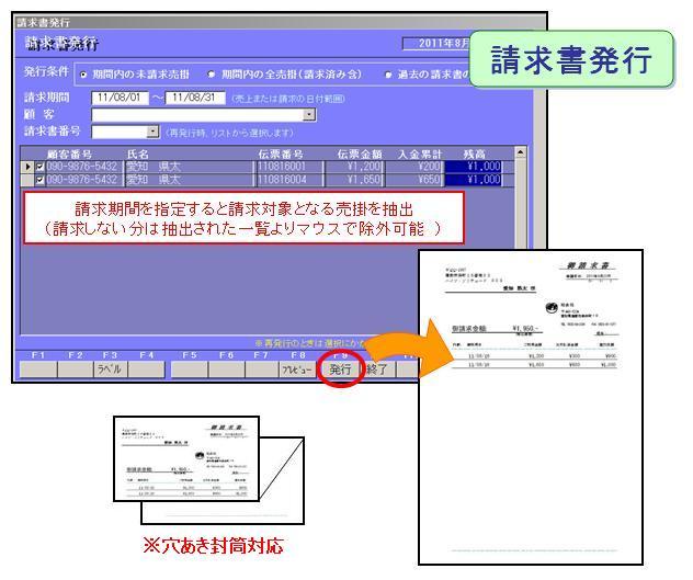 穴あき封筒に対応した請求書の発行、DMラベルの印刷機能など充実した請求処理も特徴。