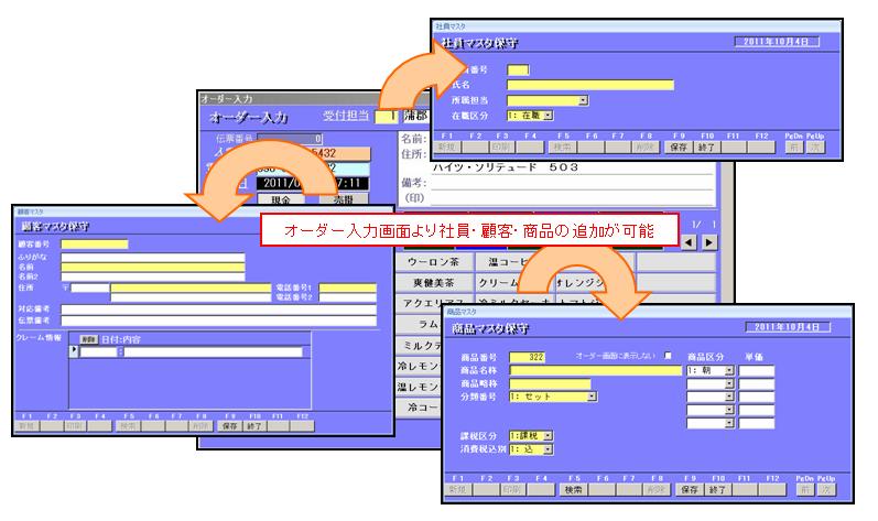 オーダー入力画面から社員・顧客・商品の追加も可能なので